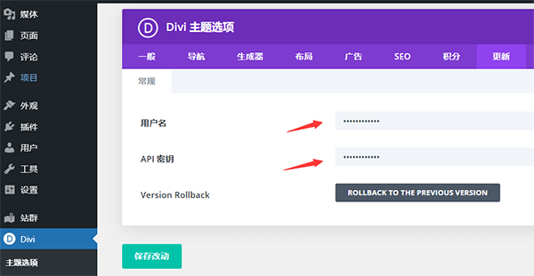 付费的主题一般都需要激活才能实现自动更新和其他的一些高级功能,Divi的更新同样需要用户名和API密钥