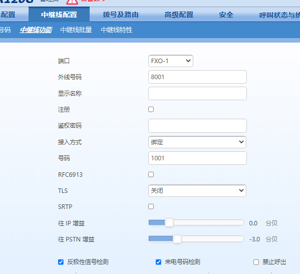 中继线配置,选择中继线功能,外线从端口FXO-1,外线 8000 开始的,为了统一我改成了8001开始,这个可以不用更改,当需要 外线与内线一一对应的时候,要绑定一个号码,我们绑定的是 8001->1001,如果我们统计通话时长,需要开通 反极性信号检测 ,否则通话时长不准。反极性信号 这个功能是需要联系运营商开通,默认为不开通的,如运营商没有开通,而我们勾选了反极性信号检测时,通话50秒左右的时候会自动挂断。