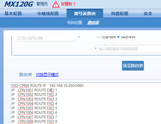第一行为呼入路由,将所有的呼入转到服务器 192.168.10.250 服务器(freeSwitch)上,FS服务器相关配置请参考其它文章。