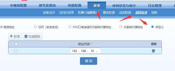 以上配置完成后,如果出现呼出/呼入异常,我们可以查看 安全->语音安全 是否配置了 IP授信地址,添加上我们的 FS服务器地址,再进行测试