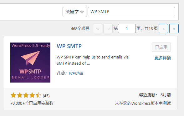 二、WP SMTP 插件的安装,在WordPress 后台找到 安装插件(插件/安装插件),搜索 WP SMTP,点击安装,安装成功后点击 启用。