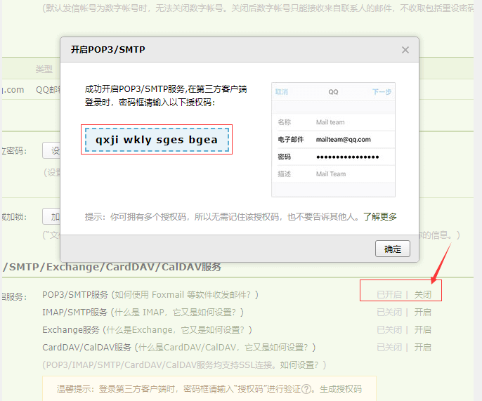 在页面中找到 POP3/IMAP/SMTP/Exchange/CardDAV/CalDAV服务 ,开启 POP3/SMTP服务,点击后会要求发送短信,按提示发送,发送完成后点已发送,会出现下图中的授权码,复制授权码,后面会用到。