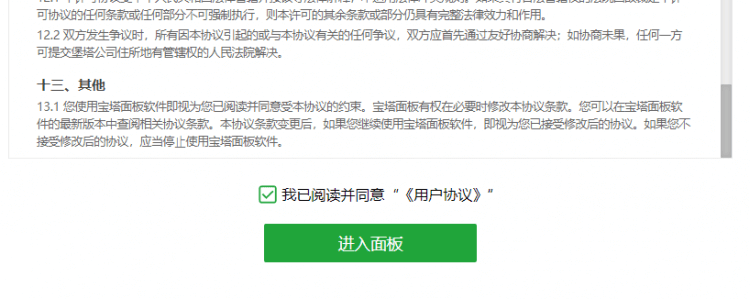 安装完宝塔面板后,使用生成的用户名密码登录到服务器,首次登录时会出现用户协议,滑到最底下后点击 我已阅读并同意 进入面板