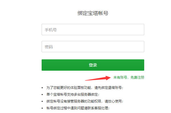 输入宝塔的账号密码进行绑定,如果没有账号点击未有账号,免费注册,进行注册后再登录