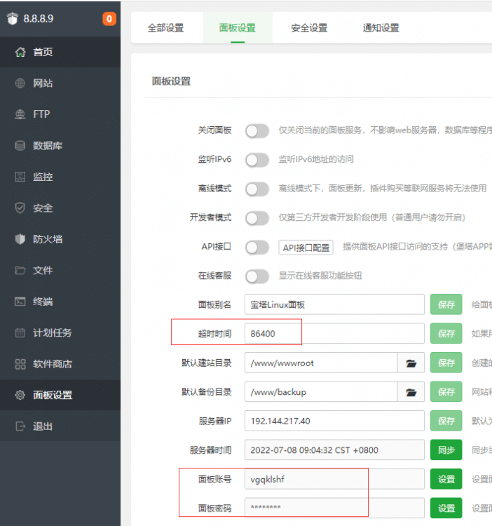 软件安装完成后,可以进行一些简单的设置,通常建议修改面板端口,修改后一定要去服务器后台修改防火墙配置,添加端口,安全入口为随机生成,可自愿修改
