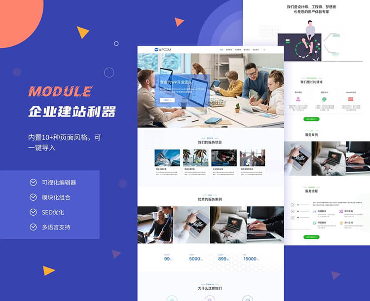 Module主题采用全新模块化开发,首页模块可视化拖拽自由组合,可自定义搭建出不同行业适用的企业网站。同时主题全面支持WPML多语言切换,可轻松搭建外贸网站。 购买链接 联系站长可优惠