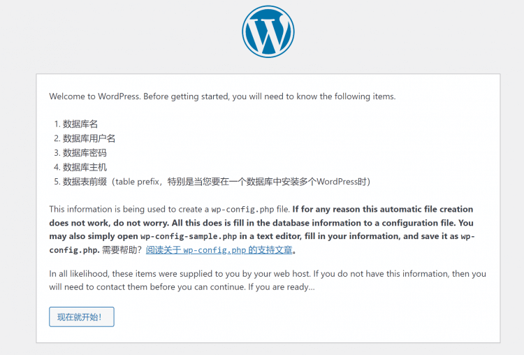 首先下载最新版WordPress 程序,下载软件最好是在官方下载,不要在乱七八糟的网站上下载,很容易中毒的,官网下载地址: https://cn.wordpress.org/latest-zh_CN.zip ,下载后上传 压缩包到网站目录并进行解压,解压后为 wordpress 目录,要将里面的文件复制到网站的跟目录,不然访问时会出错,正常情况访问会出现下面的界面,点击现在就开始