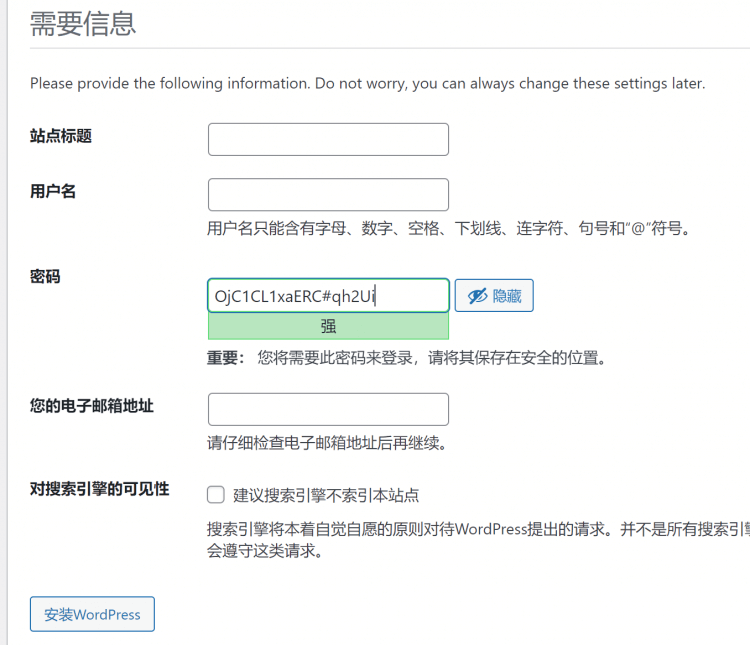 填写网站名称及管理员用户名及密码信息,对搜索引擎的可见性一定不要勾选,勾选后搜索引擎就不会收录了,
